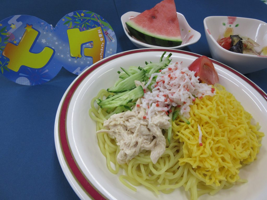 2025.08.15 地域の皆さまへ総合お知らせ 8月の病院行事食のご紹介 栄養科では8月7日に月遅れの「七夕」の行事食を提供しました。 献立は暑い日にぴったり、具だくさんで彩の良い冷やし中華にしました、あいにく当日は何日かぶりの雨降り☔となり、天の川🌌は見えませんでしたが、恵みの雨の日となりました。 次回の行事食もお楽しみに! 献立内容 ・冷し中華・揚げ野菜おろしつゆ・フルーツ(すいか)🍉