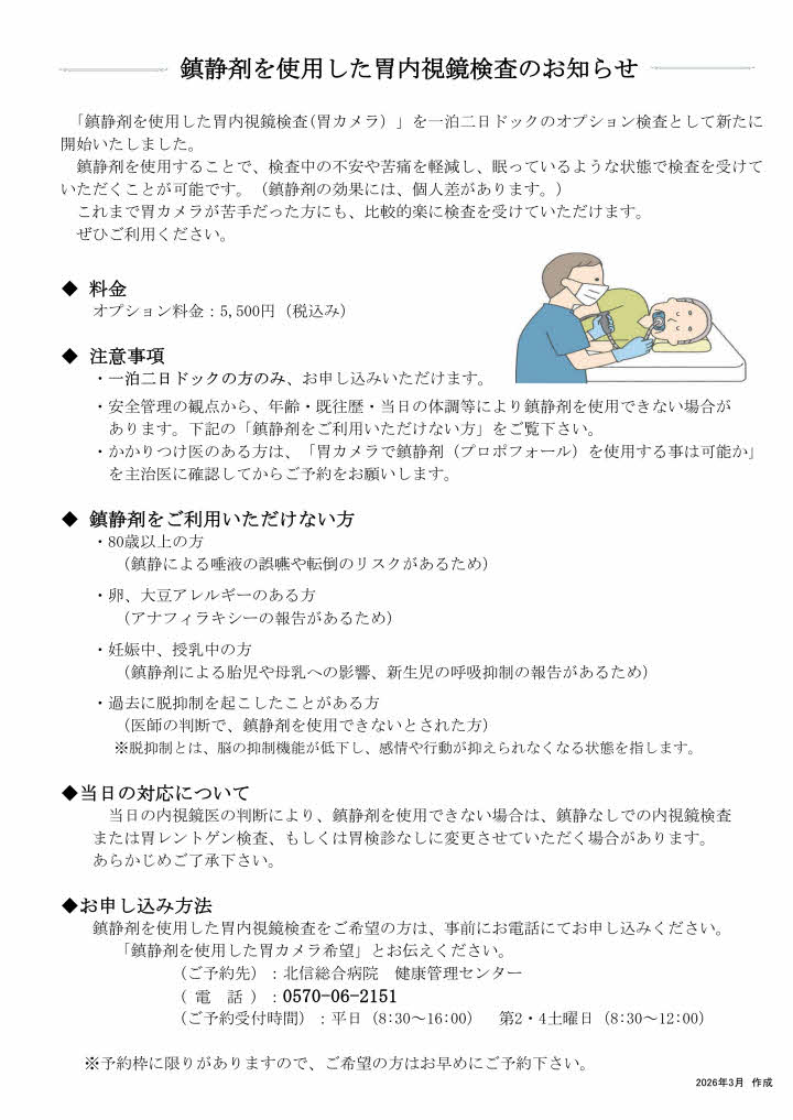 2026.04.23 「鎮静剤を使用した胃内視鏡検査(胃カメラ)」開始のおしらせ(一泊二日ドックのオプション検査) 「鎮静剤を使用した胃内視鏡検査(胃カメラ)」を一泊二日ドックのオプション検査として新たに開始しました。 鎮静剤を使用することで検査中の不安や苦痛を軽減し、眠っているような状態で検査を受けていただくことが可能です。(鎮静剤の効果には個人差があります。) これまで胃カメラが苦手だった方にも、比較的楽に検査を受けていただけます。ぜひご利用ください。 ダウンロードはこちら