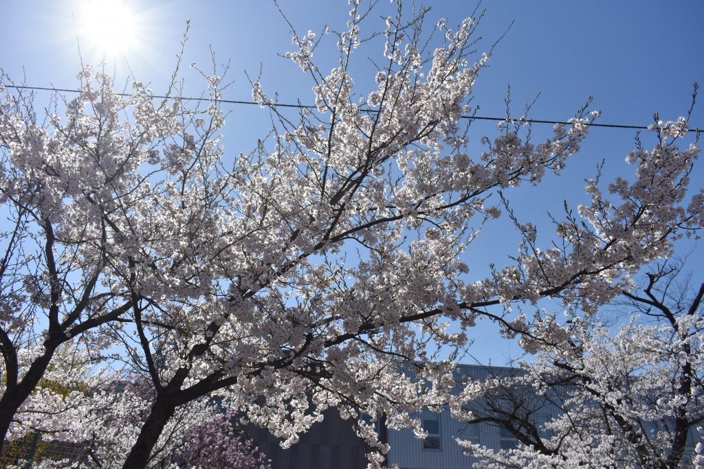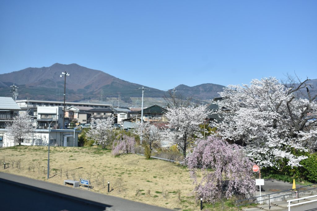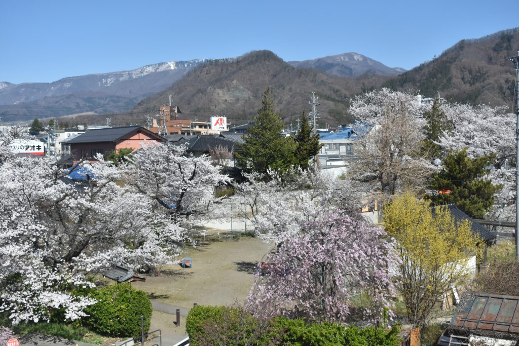 2026.04.08 西公園の桜がただいま満開 肌寒さの中でも、太陽の光を受けてひときわ美しく咲き誇っています。来院された方や職員、近隣の皆さまも思わず足を止め、見入っていました。 西公園満開の桜と志賀高原の山々 西公園の桜と高社山